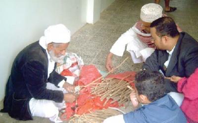 قائد علي – (42) عاما- يجلس أمام المساجد لبيع السواك في رمضان’وفي غير رمضان يعمل في مهنة أخرى حسب متطلبات الناس في المواسم.