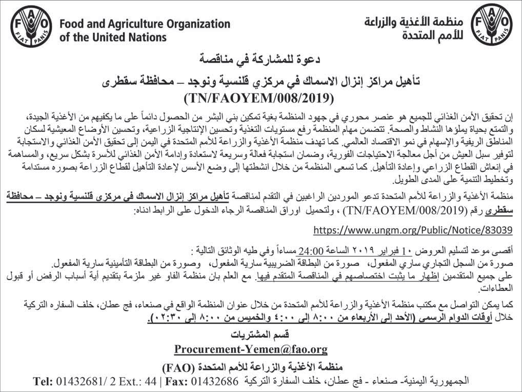 إعلان مناقصة تأهيل مراكز إنزال الأسماك في مركز قلنسية ونوجد بمحافظة سقطرى مناقصات On يناير 28, 2019 Share Share FacebookTwitterWhatsAppTelegramGoogle+البريد الإلكترونيPrint