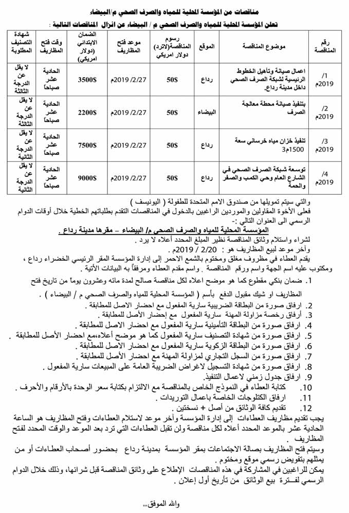 إعلان مناقصات من المؤسسة المحلية للمياه والصرف الصحي م البيضاء مناقصات On يناير 29, 2019 Share Share FacebookTwitterWhatsAppTelegramGoogle+البريد الإلكترونيPrint