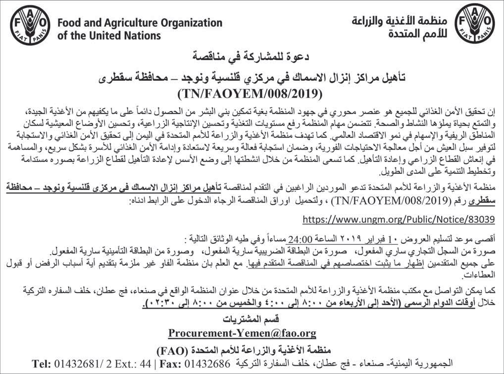 إعلان مناقصة تأهيل مراكز إنزال الأسماك في مركزي قلنسية ونوجد بمحافظة سقطرى مناقصات On يناير 29, 2019 Share Share FacebookTwitterWhatsAppTelegramGoogle+البريد الإلكترونيPrint