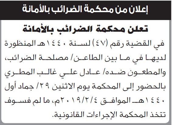 إعلان من محكمة الضرائب بالأمانة محاكم On يناير 31, 2019 Share Share FacebookTwitterWhatsAppTelegramGoogle+البريد الإلكترونيPrint