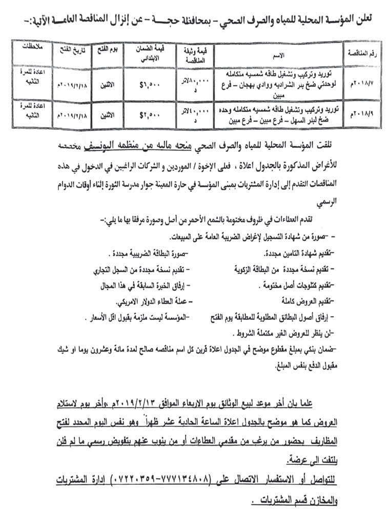 إعلان مناقصة من المؤسسة المحلية للمياه والصرف الصحي بمحافظة حجة مناقصات On يناير 31, 2019 Share Share FacebookTwitterWhatsAppTelegramGoogle+البريد الإلكترونيPrint