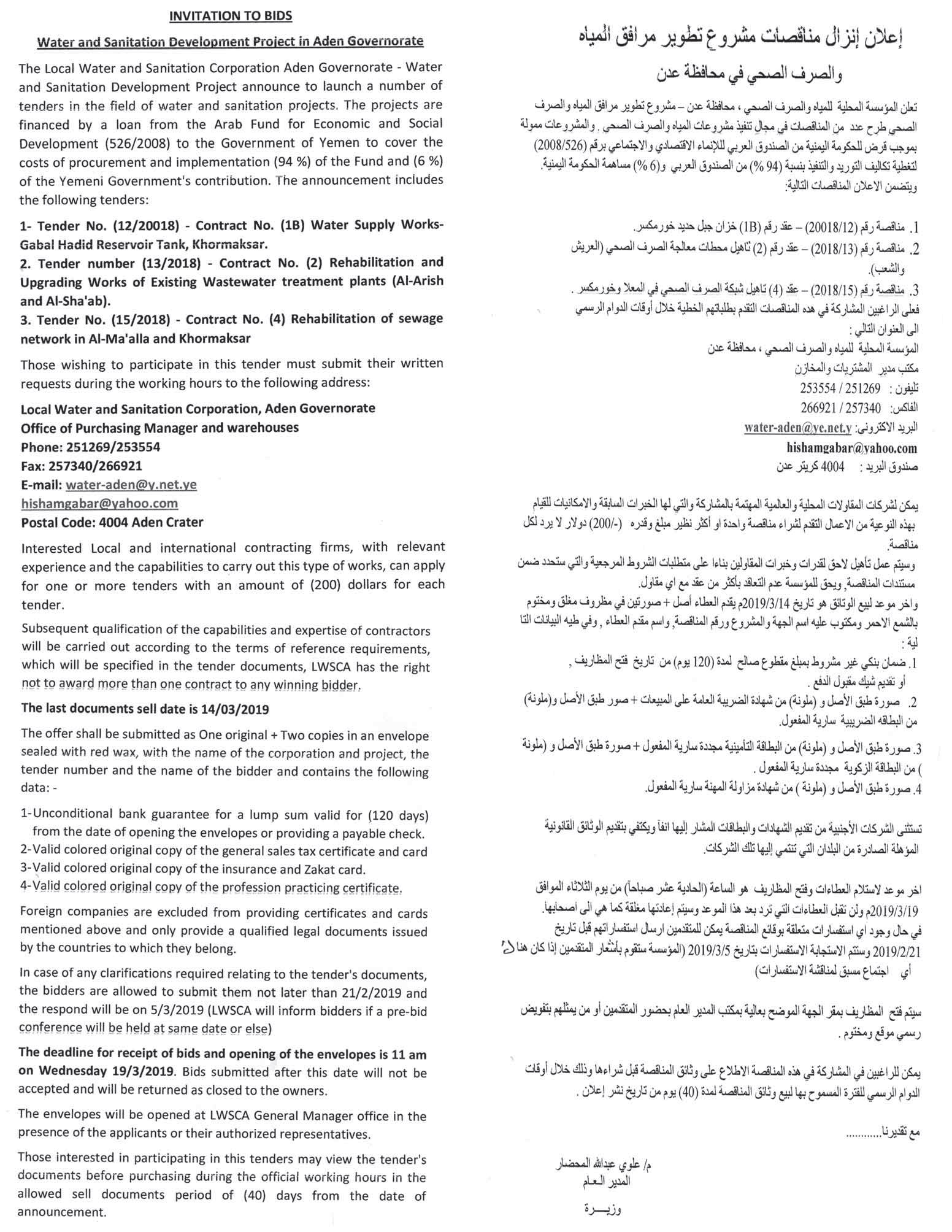 اعلان انزال مناقصات مشروع تطوير مرافق المياة بمحافظة عدن مناقصات On فبراير 5, 2019 Share Share FacebookTwitterWhatsAppTelegramGoogle+البريد الإلكترونيPrint