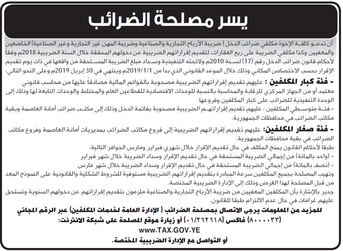 إعلان يسر مصلحة الضرائب اخرى On فبراير 5, 2019 Share Share FacebookTwitterWhatsAppTelegramGoogle+البريد الإلكترونيPrint