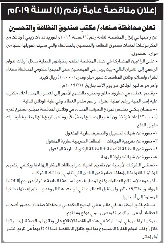 إعلان مناقصة من مكتب صندوق النظافة والتحسين محافظة صنعاء مناقصات On فبراير 6, 2019 Share Share FacebookTwitterWhatsAppTelegramGoogle+البريد الإلكترونيPrint