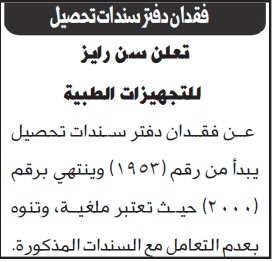 إعلان سن رايز للتجهيزات الطبية عن فقدان دفتر سندات فقدانات On فبراير 7, 2019 Share إعلان سن رايز للتجهيزات الطبية عن فقدان دفتر سندات Share FacebookTwitterWhatsAppTelegramGoogle+البريد الإلكترونيPrint