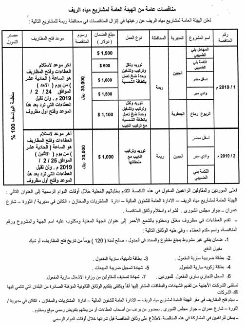 إعلان مناقصات عامة من الهيئة العامة لمشاريع مياه الريف مناقصات On فبراير 8, 2019 Share Share FacebookTwitterWhatsAppTelegramGoogle+البريد الإلكترونيPrint