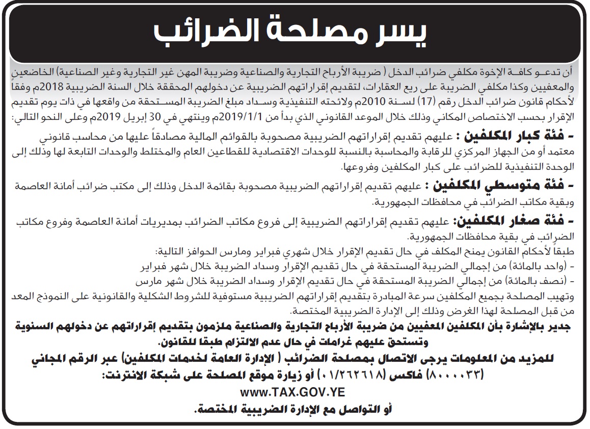 يسر مصلحة الضرائب اخرى On فبراير 9, 2019 Share Share FacebookTwitterWhatsAppTelegramGoogle+البريد الإلكترونيPrint