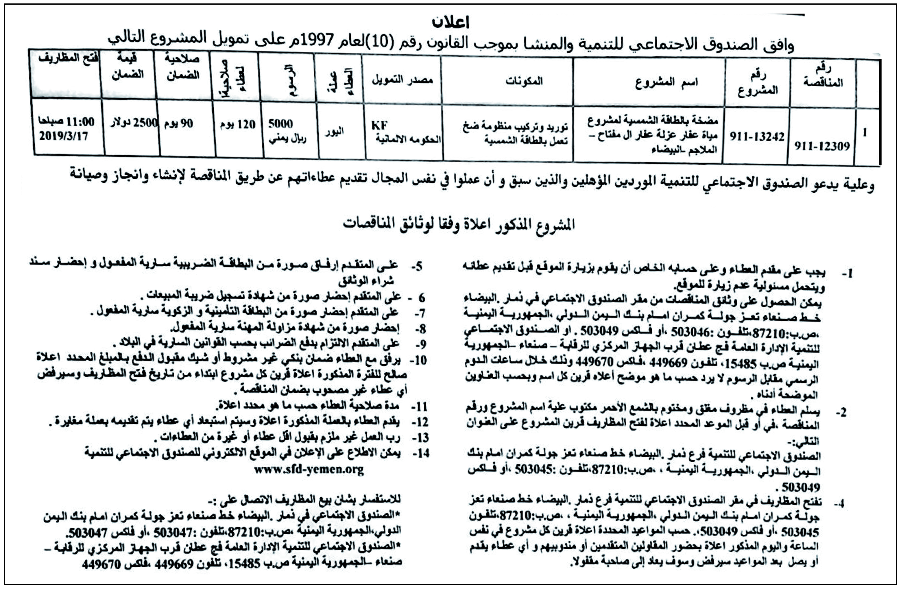 إعلان مناقصات من صندوق الإجتماعي للتنمية مناقصات On فبراير 10, 2019 Share Share FacebookTwitterWhatsAppTelegramGoogle+البريد الإلكترونيPrint