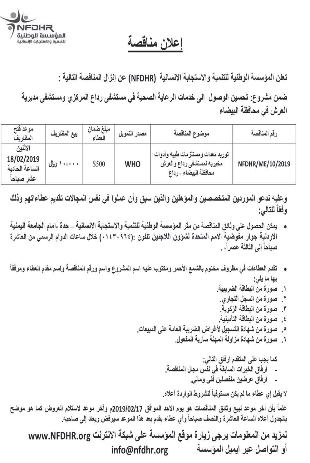 إعلان مناقصة من المؤسسة الوظنية للتنمية والأستجابة الأنسانية مناقصات On فبراير 11, 2019 Share Share FacebookTwitterWhatsAppTelegramGoogle+البريد الإلكترونيPrint