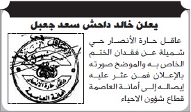 إعلان خالد داحش سعد جعبل عن فقدان الختم الخاص بة فقدانات On فبراير 12, 2019 Share Share FacebookTwitterWhatsAppTelegramGoogle+البريد الإلكترونيPrint