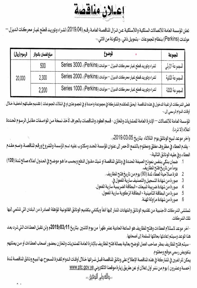 إعلان مناقصة من المؤسسة العامة للأتصالات السلكية واللأسلكية مناقصات On فبراير 12, 2019 Share Share FacebookTwitterWhatsAppTelegramGoogle+البريد الإلكترونيPrint