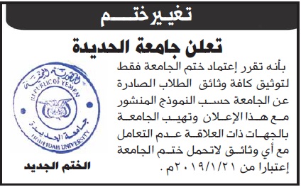 إعلان من جامعة الحديدة عن تغيير ختم اخرى On فبراير 12, 2019 Share Share FacebookTwitterWhatsAppTelegramGoogle+البريد الإلكترونيPrint