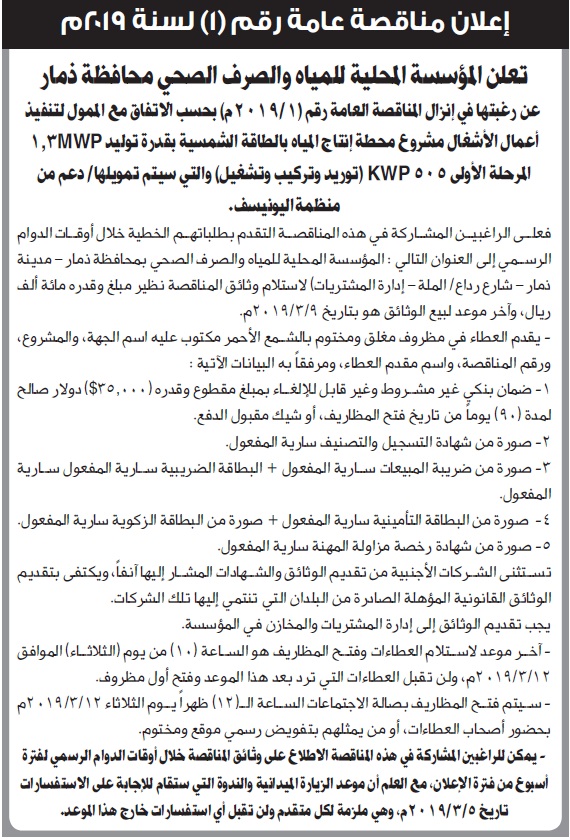 إعلان مناقصة من المؤسسة المحلية للمياة والصرف الصحي محافظة ذمار مناقصات On فبراير 12, 2019 Share Share FacebookTwitterWhatsAppTelegramGoogle+البريد الإلكترونيPrint