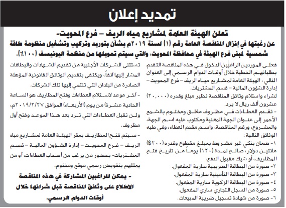 إعلان مناقصة من الهيئة العامة لمشاريع مياه الريف فرع المحويت مناقصات On فبراير 13, 2019 Share Share FacebookTwitterWhatsAppTelegramGoogle+البريد الإلكترونيPrint