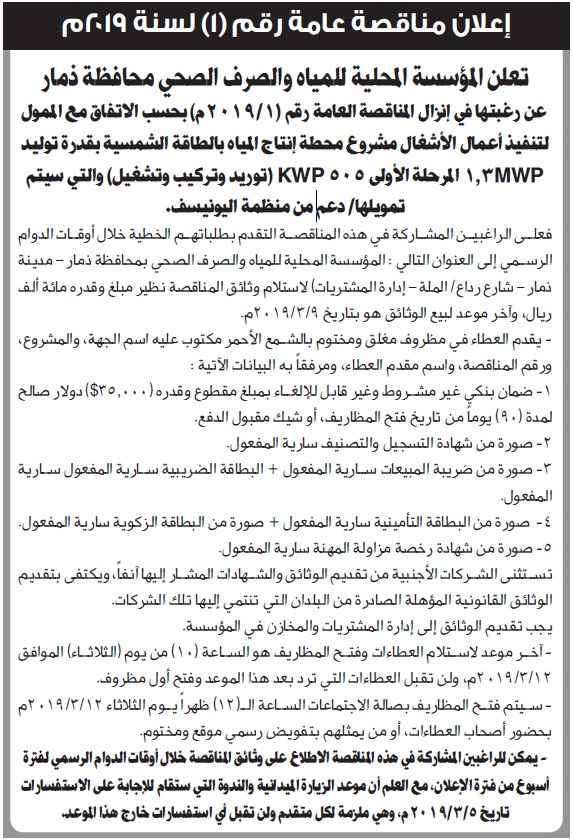 إعلان مناقصة عامة من المؤسسة المحلية للمياه والصرف الصحي محافظة ذمار مناقصات On فبراير 14, 2019 Share Share FacebookTwitterWhatsAppTelegramGoogle+البريد الإلكترونيPrint