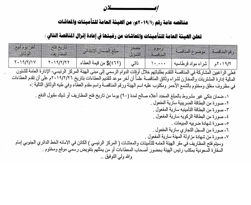 إعلان مناقصة عامة من الهيئة العامة للتأمينات والمعاشات مناقصات On فبراير 14, 2019 Share Share FacebookTwitterWhatsAppTelegramGoogle+البريد الإلكترونيPrint
