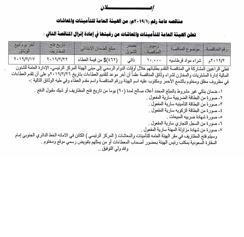إعلان مناقصة عامة من الهيئة العامة للتأمينات والمعاشات مناقصات On فبراير 15, 2019 Share Share FacebookTwitterWhatsAppTelegramGoogle+البريد الإلكترونيPrint