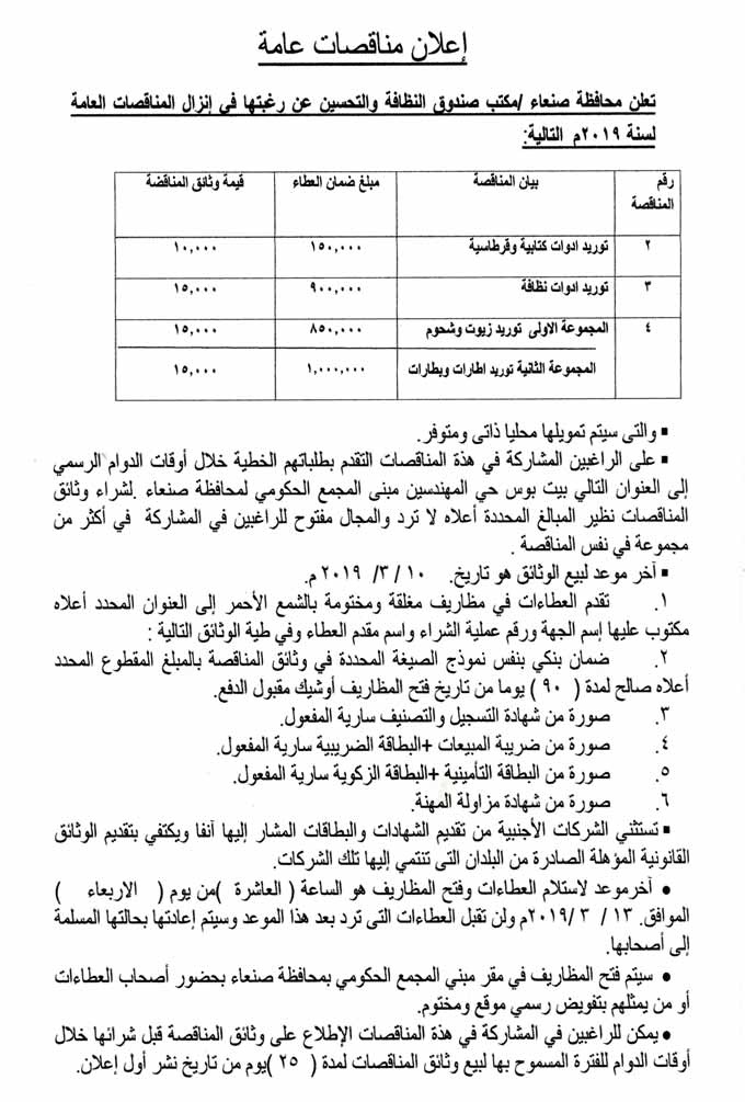 إعلان مناقصات عامة من مكتب صندق النظافة والتحسين محافظة صنعاء مناقصات On فبراير 16, 2019 Share Share FacebookTwitterWhatsAppTelegramGoogle+البريد الإلكترونيPrint