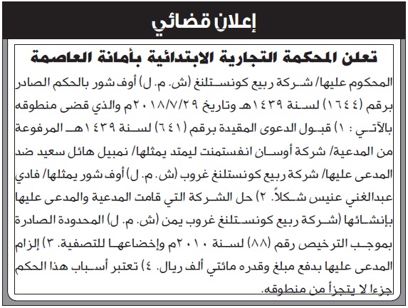 إعلان قضائي محاكم On فبراير 17, 2019 Share Share FacebookTwitterWhatsAppTelegramGoogle+البريد الإلكترونيPrint