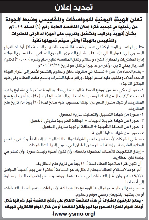 إعلان مناقصة من الهيئة اليمنية للمواصفات والمقاييس مناقصات On فبراير 17, 2019 Share Share FacebookTwitterWhatsAppTelegramGoogle+البريد الإلكترونيPrint