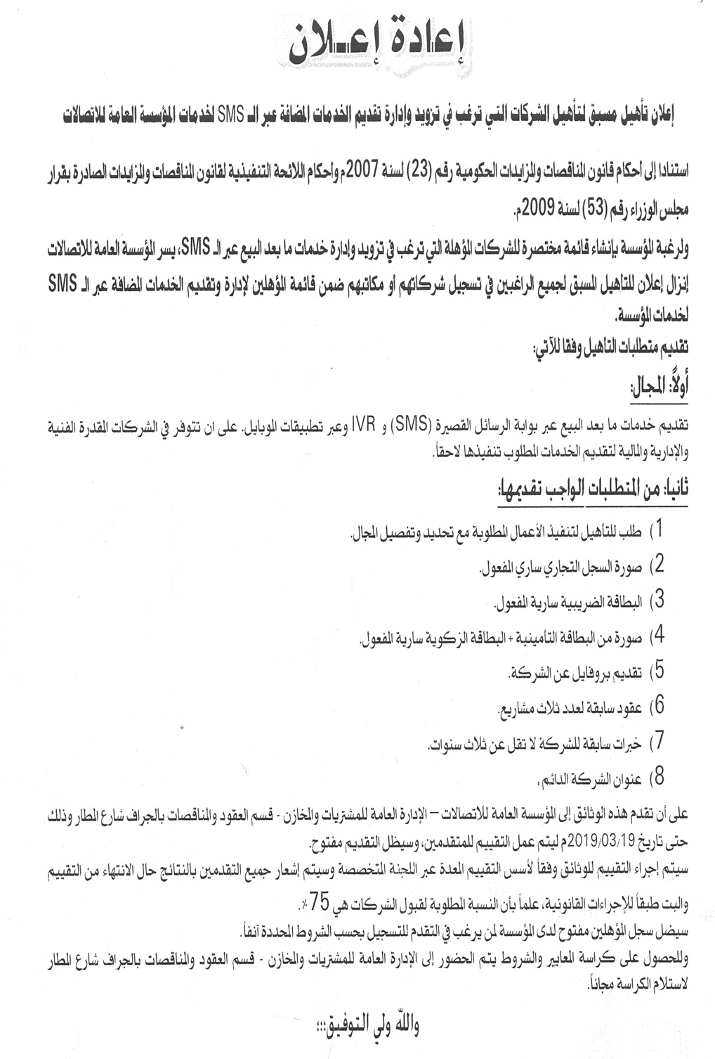 إعلان تأهيل مسبق لتأهيل الشركات التي ترغب في تزويد اخرى On فبراير 19, 2019 Share Share FacebookTwitterWhatsAppTelegramGoogle+البريد الإلكترونيPrint