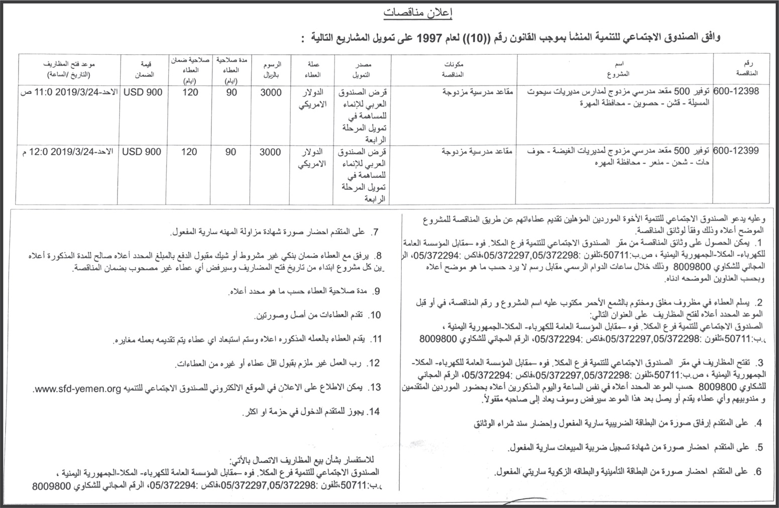 إعلان مناقصات من الصندوق الأجتماعي للتنمية مناقصات On فبراير 19, 2019 Share Share FacebookTwitterWhatsAppTelegramGoogle+البريد الإلكترونيPrint