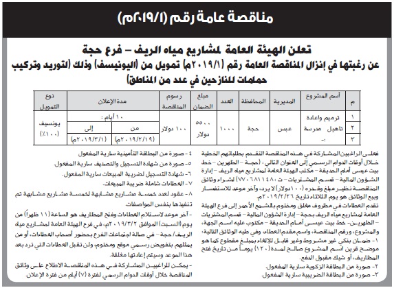 إعلان مناقصة عامة من الهيئة العامة لمشاريع مياه الريق فرع حجة مناقصات On فبراير 19, 2019 Share Share FacebookTwitterWhatsAppTelegramGoogle+البريد الإلكترونيPrint