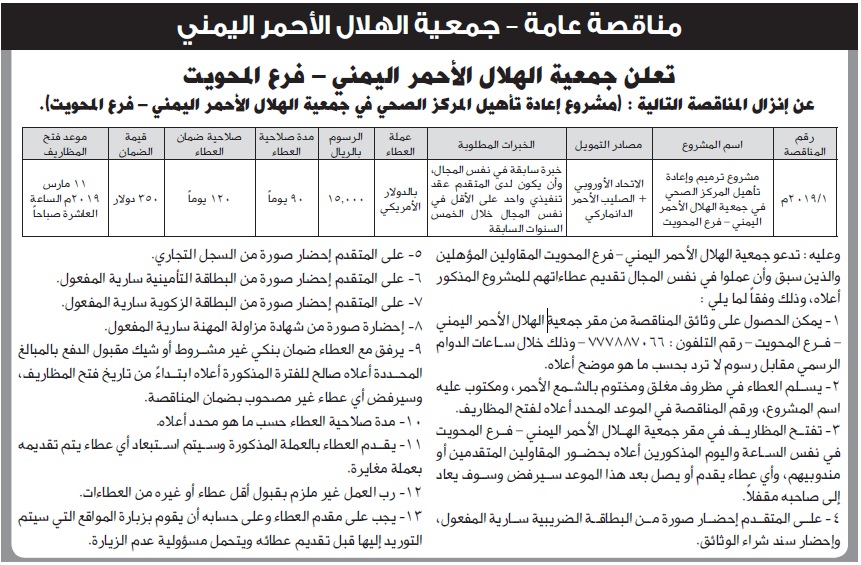 إعلان مناقصة عامة من جمعية الهلال الأحمر اليمني فرع المحويت مناقصات On فبراير 19, 2019 Share Share FacebookTwitterWhatsAppTelegramGoogle+البريد الإلكترونيPrint