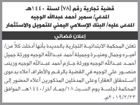 إعلان قضائي محاكم On فبراير 20, 2019 Share Share FacebookTwitterWhatsAppTelegramGoogle+البريد الإلكترونيPrint