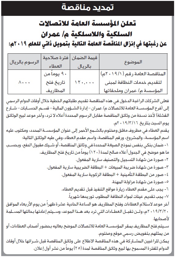 إعلان مناقصة من المؤسسة العامة للأتصالات السلكية واللاسلكية م عمران مناقصات On فبراير 20, 2019 Share Share FacebookTwitterWhatsAppTelegramGoogle+البريد الإلكترونيPrint