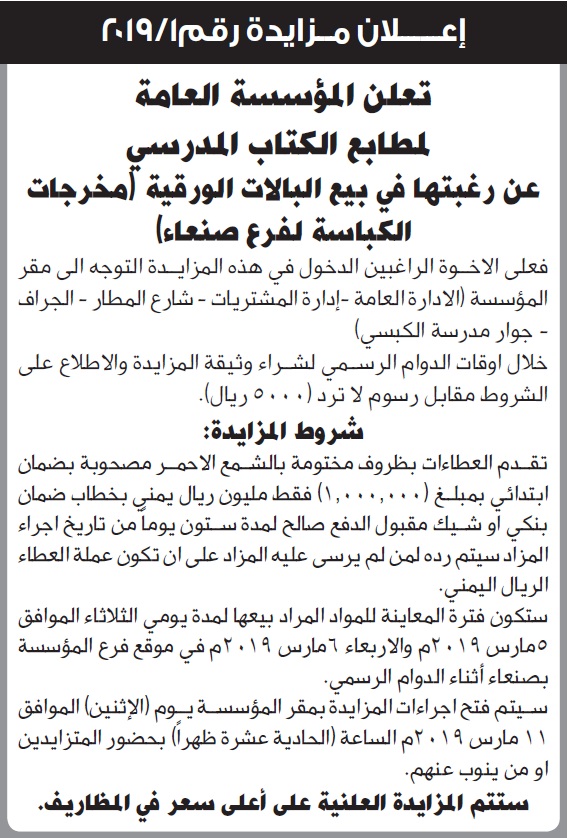 إعلان بيع من المؤسسة العامة لمطابع الكتاب المدرسي اخرى On فبراير 23, 2019 Share Share FacebookTwitterWhatsAppTelegramGoogle+البريد الإلكترونيPrint
