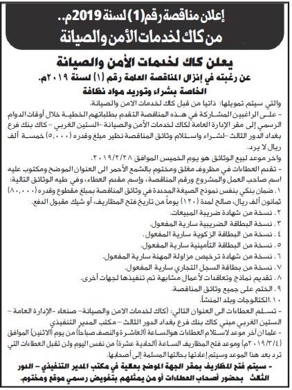 إعلان مناقصة من كاك لخدمات الأمن والصيانة مناقصات On فبراير 23, 2019 Share Share FacebookTwitterWhatsAppTelegramGoogle+البريد الإلكترونيPrint