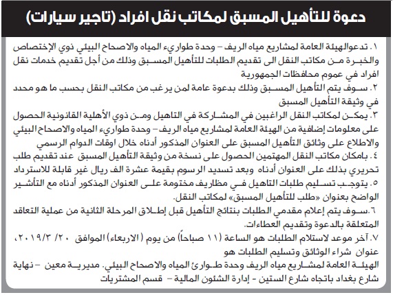 دعوة للتأهيل المسبق لمكاتب نقل افراد(تاجير سيارات) اخرى On فبراير 24, 2019 Share Share FacebookTwitterWhatsAppTelegramGoogle+البريد الإلكترونيPrint