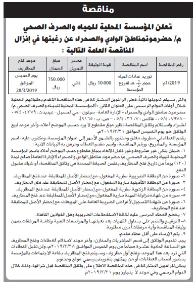 مناقصة – المؤسسة المحلية للمياه والصرف الصحي مناقصات On مارس 1, 2019 Share Share FacebookTwitterWhatsAppTelegramGoogle+البريد الإلكترونيPrint