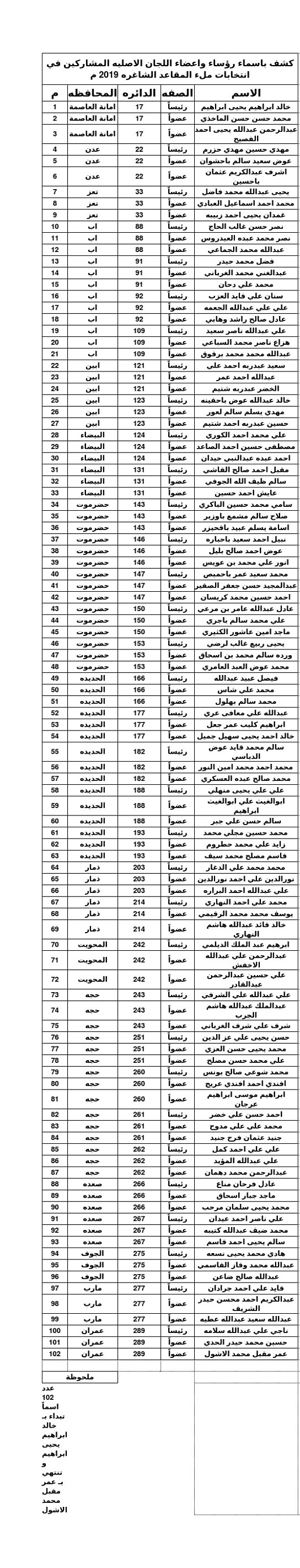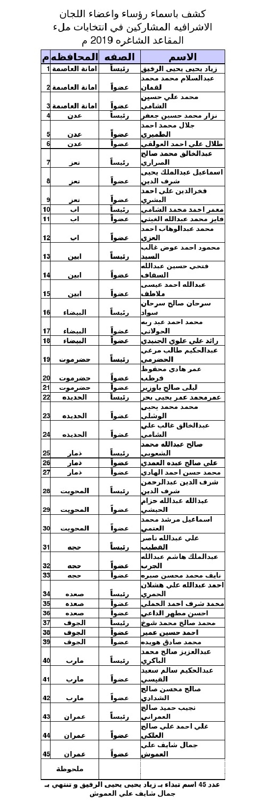 وتهيب اللجنة العليا للانتخابات بالأخوة رؤساء وأعضاء اللجان الإشرافية والأصلية السالف ذكرهم الحضور إلى مقر اللجنة العليا للانتخابات في العاصمة صنعاء في موعد أقصاه يوم الأربعاء الموافق 6 / 3 / 2019م مصطحبين معهم البطاقة الشخصية + صورتين شخصية 4 × 6، وعدم التأخر للأهمية.