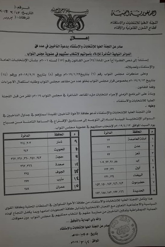 دعت اللجنة العليا للانتخابات والاستفتاء الناخبين في الدوائر الانتخابية الشاغرة وعددها 34 دائرة التوجه في الساعة الثامنة من صباح يوم السبت الموافق 13 إبريل 2019م إلى صناديق الاقتراع للإدلاء بأصواتهم لانتخاب ممثليهم لعضوية مجلس النواب.