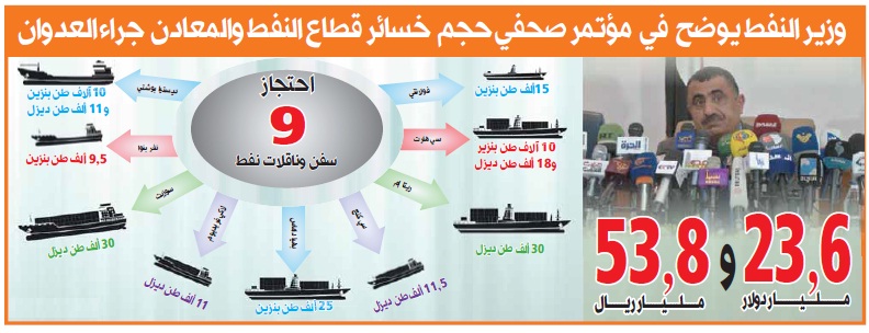وزير النفط يوضح في مؤتمر صحفي حجم خسائر قطاع النفط والمعادن جراء العدوان إنفوجــرافيك On أبريل 10, 2019 Share Share FacebookTwitterWhatsAppTelegramGoogle+البريد الإلكترونيPrint