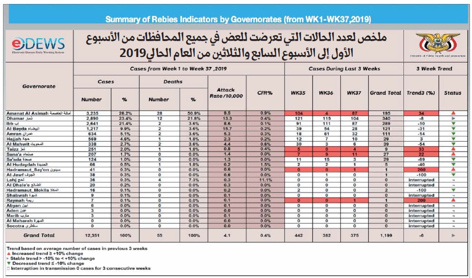 و كشف مدير عام البرنامج الوطني لمكافحة داء الكلب أن الإحصائيات التحليلية لبيانات البرنامج لتسع سنوات 2011-2019 تشير إلى أن عدد حالات الذين تعرضوا لداء الكلب خلال تسعة أعوام ( 2011 –2019) (96,674) بمتوسط يصل إلى 10,742 حالة في العام الواحد اي بمعدل حدوث 52 حالة لكل 100.000 من السكان في العام الواحد.