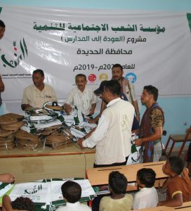 كما اصلت مؤسسة الشعب الاجتماعية للتنمية ، الأحد في محافظة الحديدة مشروع (العودة إلى المدرسة) بتوزيع الحقائب المدرسية ومستلزماتها على الطلاب النازحين والمحتاجين بمديرية السخنة.