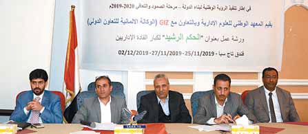 مشيرين إلى أن ورش العمل الخاصة بالحكم الرشيد والتي انعقدت يوم الاثنين الماضي وامس الاربعاء وتختتم الاحد المقبل في صنعاء بتنظيم مشترك من قبل المعهد الوطني للعلوم الادارية والوكالة الالمانية للتنمية “جي.اي.زد” وتستهدف عددا من كبار القادة الاداريين بالدولة تمثل اولى خطوات الترجمة العملية لـ6 أهداف استراتيجية تضمنتها الرؤية الرؤية الوطنية والرامية الى تطوير مهارات الجهاز الإداري للدولة وترسيخ مبادئ واسس الحكم الرشيد وممارساته بمختلف مؤسسات الدولة المركزية والمحلية.