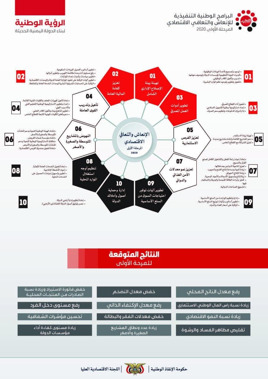 ووفقا للرؤية الوطنية تعمل المرحلة الأولى من خطة الإنعاش والتعافي الاقتصادي على نقل اليمن من حالة الفقر والبطالة والتخلف الإداري وتباطؤ التنمية والعجز المالي إلى واقع اخر يلبي تطلعات وآمال كل أبناء الشعب اليمني، من خلال 10 برامج وطنية تنفيذية للإنعاش والتعافي الاقتصادي.