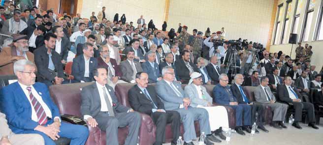 من جانبه قال رئيس مجلس الشورى محمد حسين العيدروس” نجتمع اليوم في ذكرى استشهاد فقيه الدستور والقانون والقامة الأكاديمية والوطني الصادق ورجل الحوار الفذ البروفيسور أحمد عبدالرحمن شرف الدين بالتزامن مع الذكرى السنوية للشهيد”.