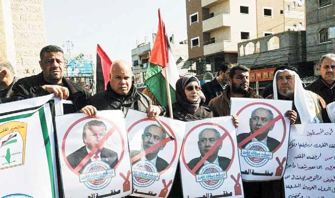 وأعلن الرئيس الأمريكي، في وقت سابق من أمس الأول، بنود “صفقة القرن” التي طال انتظارها وعمل عليها منذ توليه السلطة عام 2017م، وتنص على تسوية الصراع الفلسطيني الإسرائيلي بناء على صيغة حل الدولتين مع بقاء القدس عاصمة “موحدة” لإسرائيل وتخصيص أجزاء من الجانب الشرقي للمدينة للعاصمة الفلسطينية، إضافة إلى سيادة إسرائيل على غور الأردن والمستوطنات في الضفة الغربية.