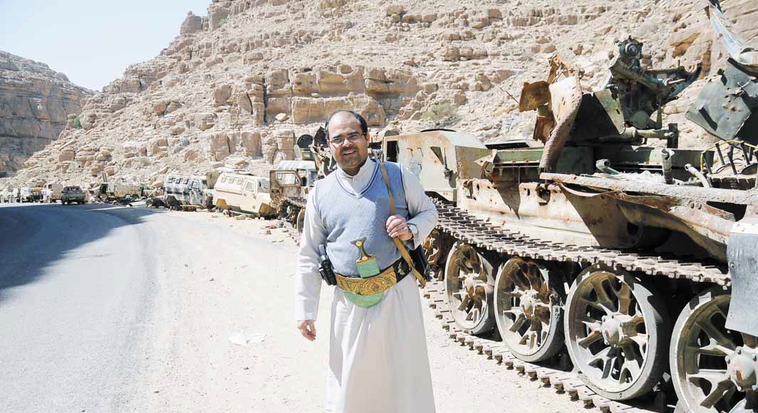 كان الطريق مليئاً بالخراب الذي خلفه القصف المباشر لطائرات العدوان، وعلى جانبيه تركت المدرعات والآليات العسكرية الحديثة، إما تالفة أو معطوبة، ومن حولنا تنطلق سيارات المقاتلين المتينة بسرعة هائلة، فيما نحن نمضي بما أتاحته لنا سيارة رئيس التحرير من سرعة معقولة، توقفنا خلالها لمشاهدة الدمار الذي خلفه قصف الطيران والمدفعية في المناطق التي عجز الحلفاء عن الوصول إليها، وظلت صواريخهم ومدفعيتهم وطائراتهم تمطرها بمختلف الغارات صباح مساء، كما شكا لنا الأهالي الذين غمرتهم مشاعر الفرحة بنتائج المعارك الأخيرة، وألسنتهم تهتف «الحمد لله، قاهر الجبارين».