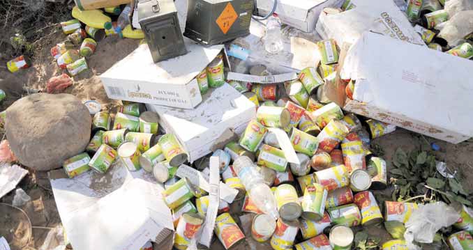 في الجوار، وعلى بعد امتار، كانت اكوام من علب المواد الغذائية مكدسة تحت شجرة إثل ضخمة في مشهد ملفت للنظر !! كيف تجمعت هذه الكمية في العراء ومن استهلكها؟! اقتربنا منها فوجدناها علباً ممتلئة وليست فارغة، بقوليات، تونا، حلويات ، ألبان، تمور، عسل،….ومواد اخرى. والى جوارها ثلاجتين صغيرتين.. وقد تبين لنا لاحقا أن تلك المواد كانت مؤنة لمجموعة من المرتزقة اتخذت من المكان موقعا عسكريا قبل أن تلوذ بالفرار.
