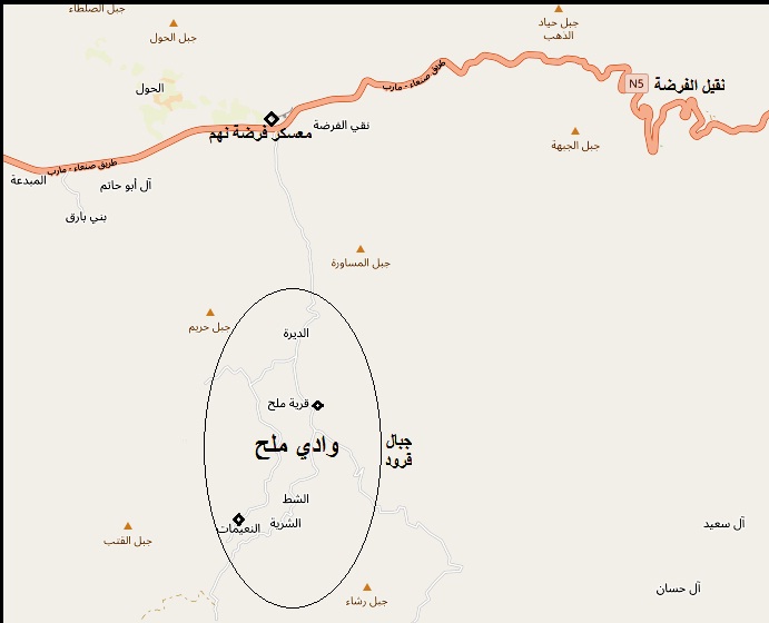 كان وادي ملح بمثابة الثغرة التي تسلل منها الغزاة إلى فرضة نهم مطلع العام 2017م، وتمكنوا بعدها من التوغل في عدد من المناطق والقرى غرب الفرضة، حتى اقتربوا من نقيل بن غيلان الذي يبعد عن العاصمة صنعاء بنحو 30 كيلومترا.