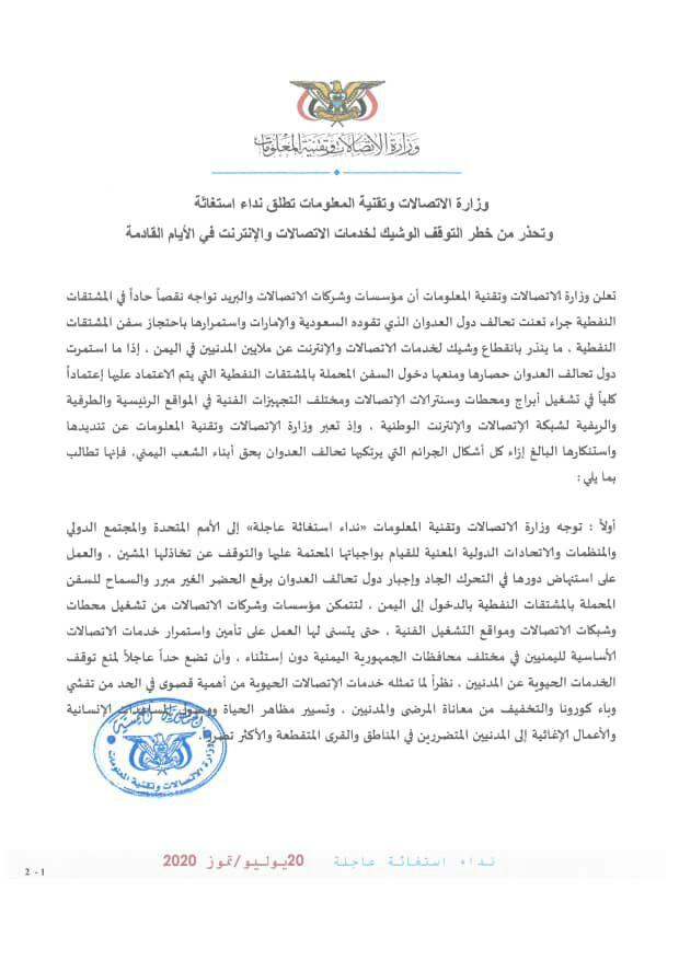 أولاً: توجه وزارة الاتصالات وتقنية المعلومات «نداء استغاثة عاجلة» إلى الأمم المتحدة والمجتمع الدولي والمنظمات والاتحادات الدولية المعنية للقيام بواجباتها المحتمة عليها والتوقف عن تخاذلها المشين، والعمل على استنهاض دورها في التحرك الجاد وإجبار دول تحالف العدوان على رفع الحظر غير المبرر والسماح للسفن المحملة بالمشتقات النفطية بالدخول إلى اليمن، لتتمكن مؤسسات وشركات الاتصالات من تشغيل المحطات والشبكات ومواقع التشغيل الفنية، حتى يتسنى لها العمل على تأمين واستمرار خدمات الاتصالات الأساسية لليمنيين في مختلف محافظات الجمهورية دون استثناء، وأن تضع حداً لمنع توقف الخدمات الحيوية عن المدنيين، نظراً لما تمثله خدمات الاتصالات الحيوية من أهمية قصوى في الحد من تفشي وباء كورونا والتخفيف من معاناة المرضى والمدنيين، وتسيير مظاهر الحياة ووصول المساعدات الإنسانية والأعمال الإغاثية إلى المدنيين المتضررين في المناطق والقرى المتقطعة والأكثر تضرراً.