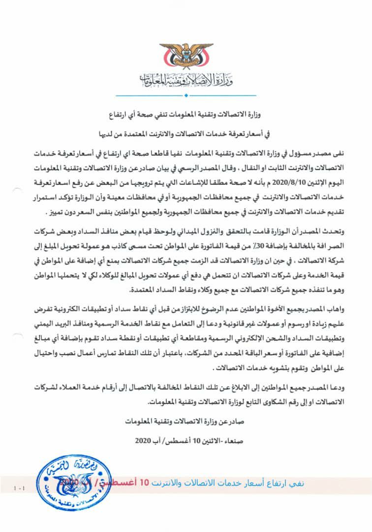 وقال المصدر لوكالة الأنباء اليمنية (سبأ)” إنه لا صحة مطلقا للإشاعات التي يتم ترويجها من قبل البعض عن رفع أسعار تعرفة خدمات الاتصالات والانترنت في جميع محافظات الجمهورية أو في محافظات معينة”.. مؤكدا استمرار الوزارة في تقديم خدمات الاتصالات والانترنت في كافة المحافظات ولجميع المواطنين بنفس السعر دون تمييز.