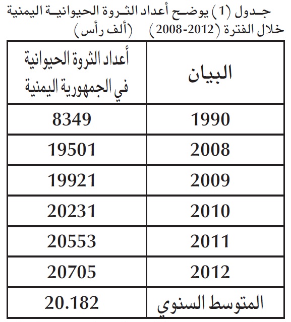 جدول (1) يوضح أعداد الثروة الحيوانية اليمنية خلال الفترة (2008-2012) (ألف رأس)